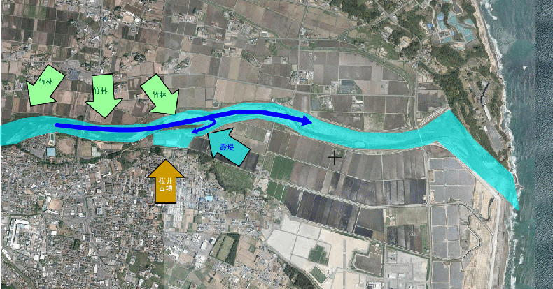 川の至る所に、竹林が、堤防の外側、内側に存在し、今はその機能は失いつつあるようですが、水害対策の跡が見受けられます。