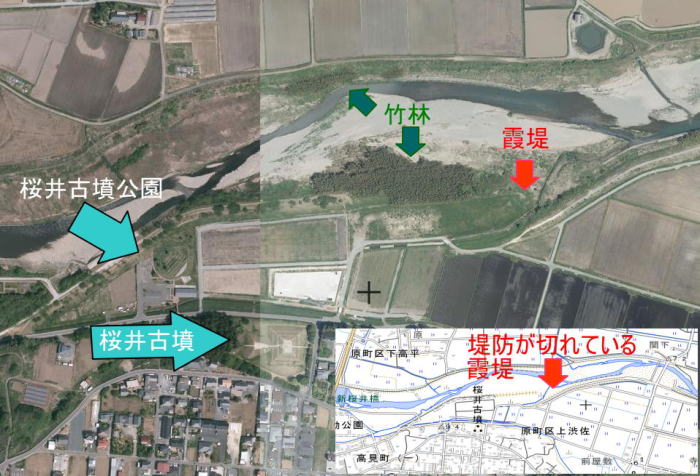 通常の洪水の場合、桜井古墳公園の前まで水が来て、その後滞水すること無く、水が引きます。